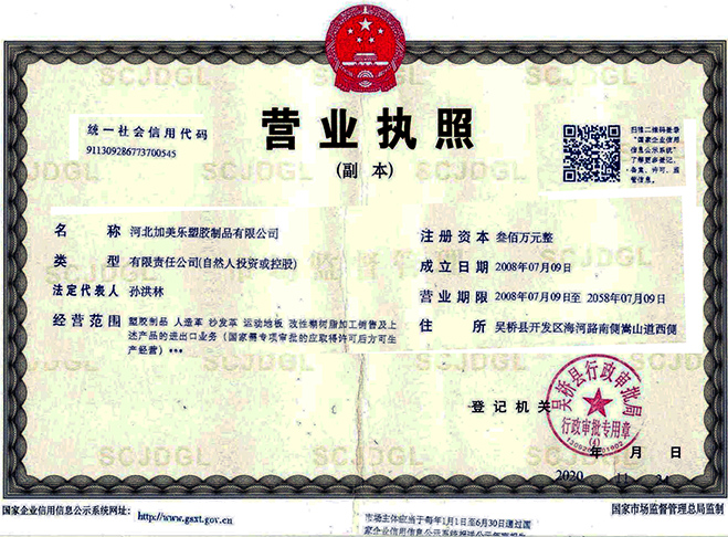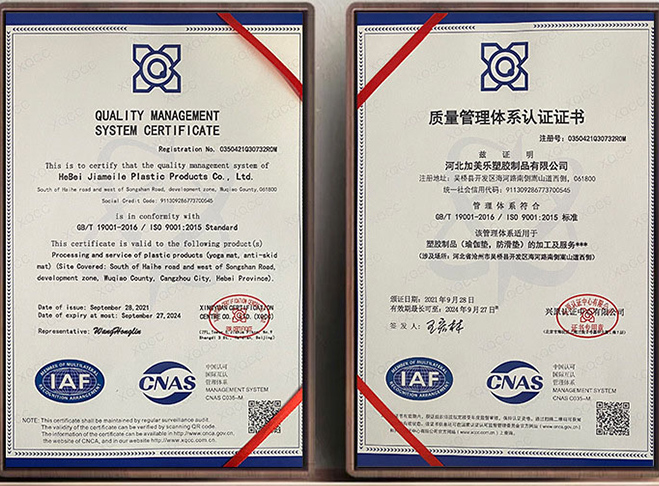 Since its establishment in 2008, Hebei Jiameile Plastic Products Co., Ltd. has grown into a pvc series anti-slip cloth manufacturer integrating production, manufacturing, research and development and sales after nearly 20 years of steady operation. Now the company has 2 advanced production lines , advanced production technology specifications, strong technical force, and passed the ISO9001:2015 quality certification system standard certification. The company's flagship product - PVC yoga mat, has all intellectual property rights. In recent years, the company has gathered relevant domestic experts and scientific researchers to carry out scientific research on product projects, and has realized a major reform of the product production process. Various products are of outstanding quality, excellent performance, It has a beautiful appearance and has obtained a national patent, patent number: ZL201010538361.3; the products are not only sold well in the domestic market, but also exported to many countries and regions such as the United States, Canada, Japan, Australia, and the Middle East.